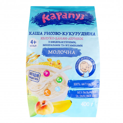 Каша молочна для дітей від 4мес рисово-кукурудзяна Яблуко-банан-абрикос Карапуз м/у 400г